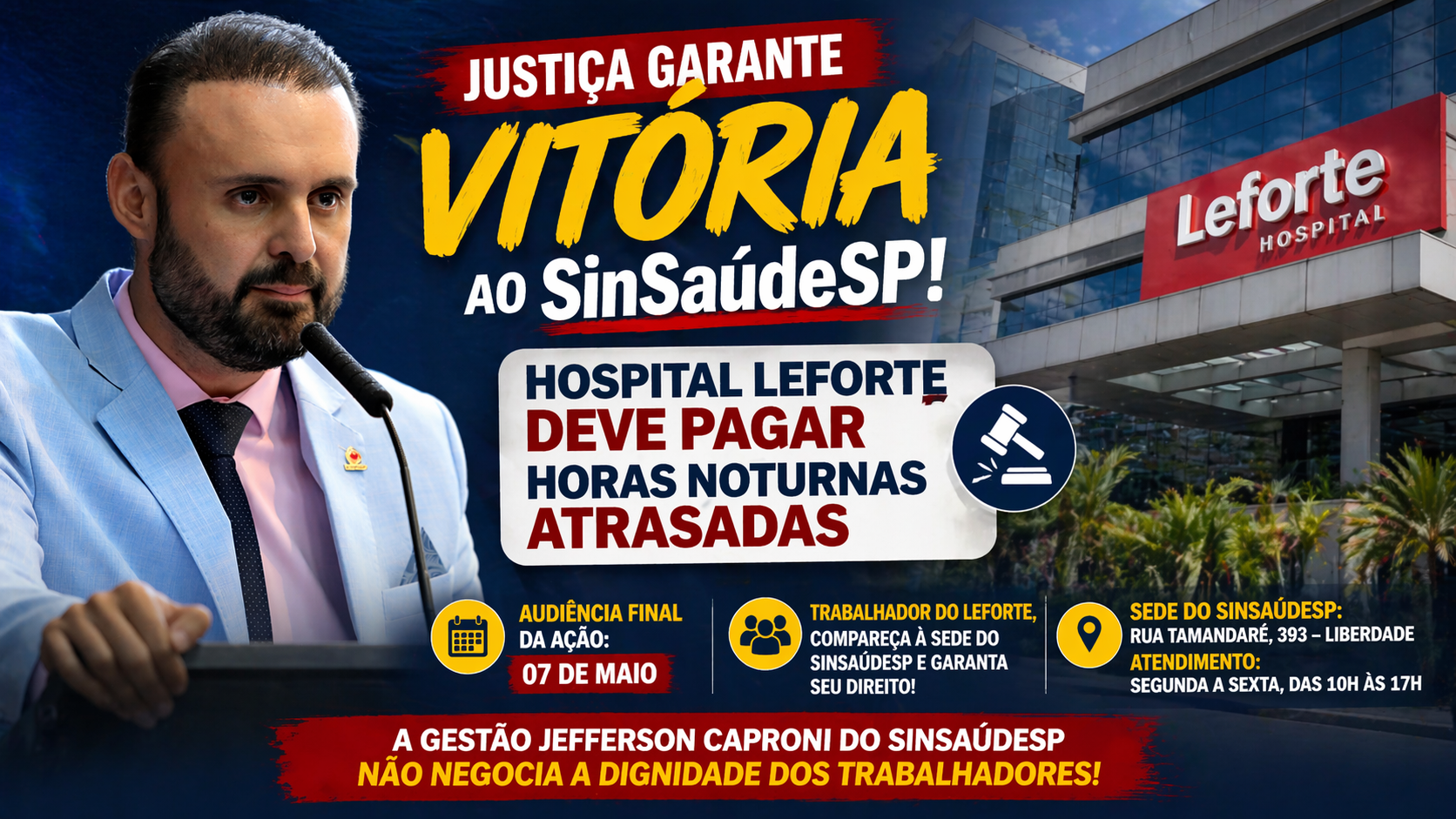 São 89 anos do Sindicato da Saúde de São Paulo. Após décadas de desafios, finalmente, em 2022, testemunhamos a redemocratização deste sindicato com a eleição de sua primeira gestão legítima. Sob a liderança do Presidente Jefferson Caproni, em união com o Vice-Presidente Reinaldo Andrade e toda a diretoria, grandes avanços estão acontecendo. A luta pelos trabalhadores e pelo bem-estar de todos, de maneira geral, segue inabalável.